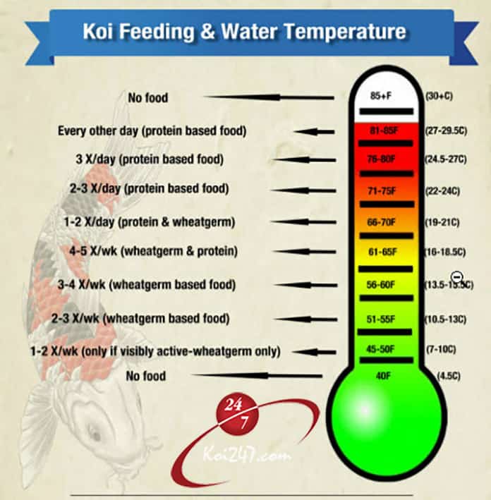 Một lợi thế rất lớn cho những bạn chơi Koi trong khu vực miền Nam là sự biến thiên nhiệt độ đều nằm trong mức không ảnh hưởng hoặc ảnh hưởng rất ít đến hệ tiêu hóa của Koi, nhưng mình cũng sẽ viết để những bạn ở khu vực khác hoặc đến một lúc nào đó ở trong Nam mình cũng có biến thiên nhiệt độ lớn thì nhớ mà áp dụng, khi nhiệt độ nước dưới 14 độ C hoặc trên 32 độ C, bộ máy tiêu hóa của Koi sẽ ngưng làm việc hoàn toàn, khi đó nếu bạn cho ăn, với tập tính trời cho, Koi vẫn sẽ ăn và thức ăn sẽ nằm lì trong bụng cho đến khi bị thiêu và Koi của bạn bơi ngửa.